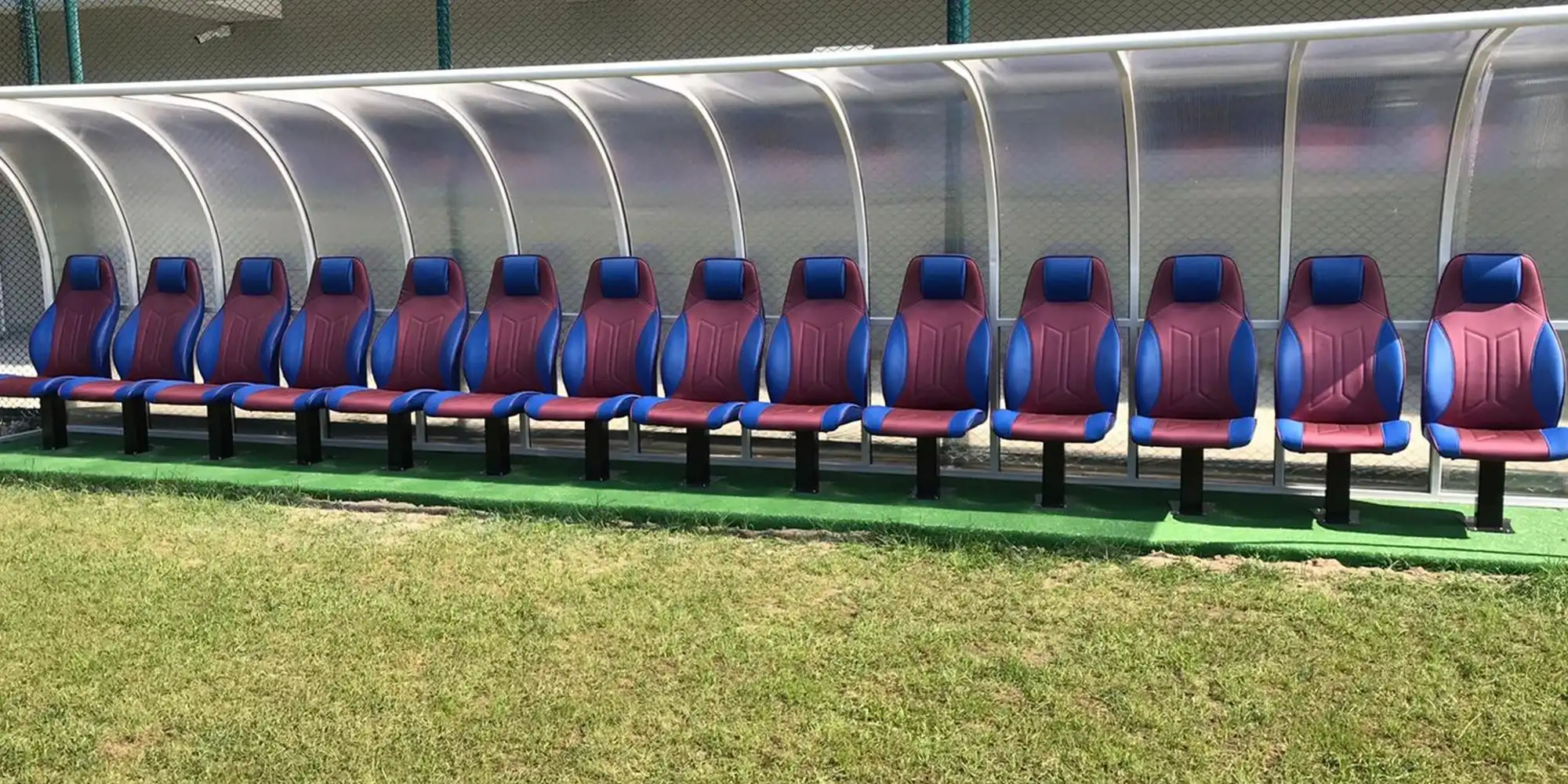 In our Competition Player Bench Seats, durable seat and backrest cushions with a robust internal frame, fire-resistant and abrasion-resistant artificial leather upholstery, high-strength plastic armrests, and corrosion-resistant metal legs are used.